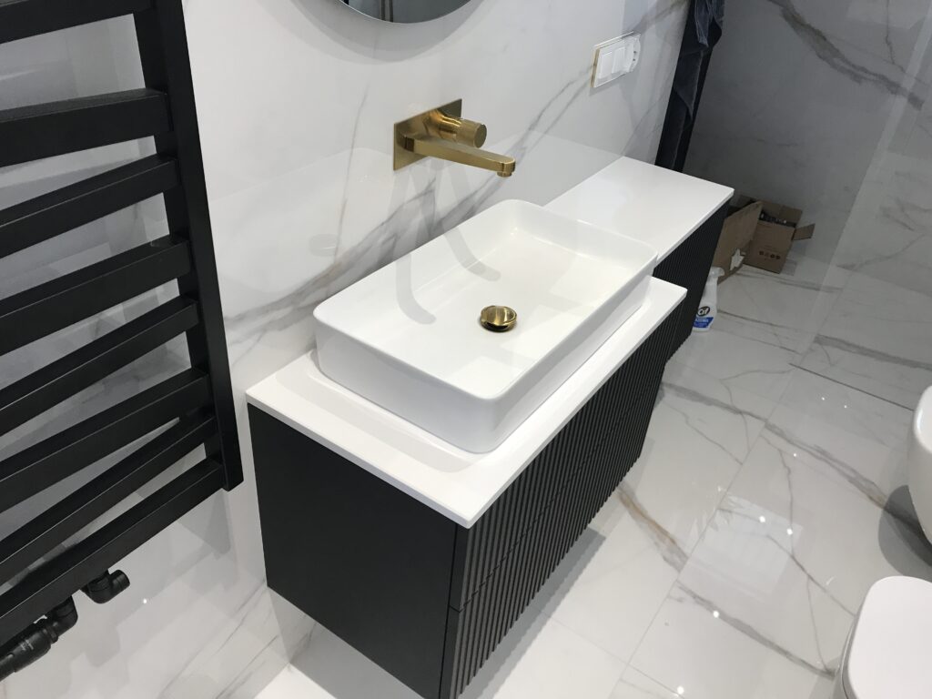 Odporne na wodę blaty z konglomeratu i fronty lakierowane.
